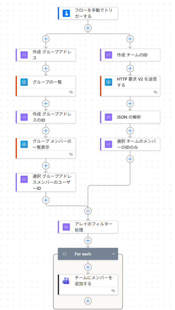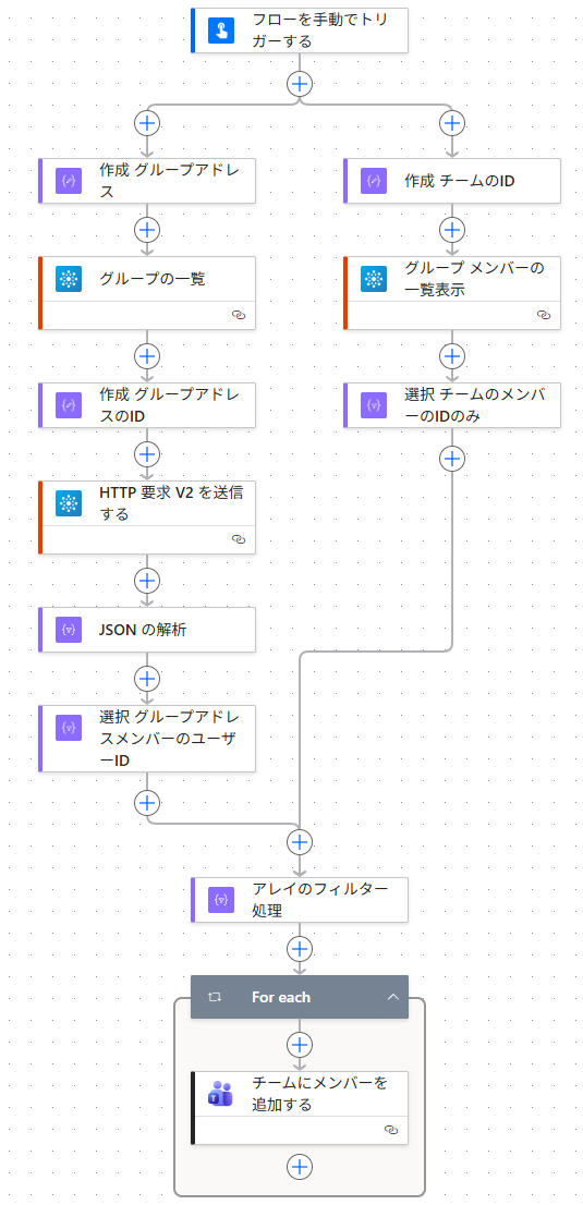 最後にMicrosoft Teamsコネクタの「チームにメンバーを追加する」アクションで、「アレイのフィルター処理」の結果で得られるユーザーのGUID配列をチームに追加して完了。